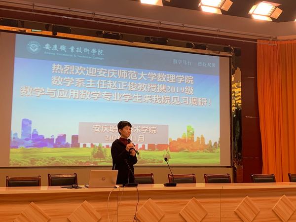 11月5日上午,安慶師范大學數(shù)理學院數(shù)學系2019級數(shù)學與應用數(shù)學專業(yè)253名同學到安慶職業(yè)技術(shù)學院見習調(diào)研。安慶師范大學數(shù)理學院數(shù)學系主任趙正俊教授帶隊。安慶職業(yè)技術(shù)學院教務處、馬克思主義學院負責同志接待了師大師生。