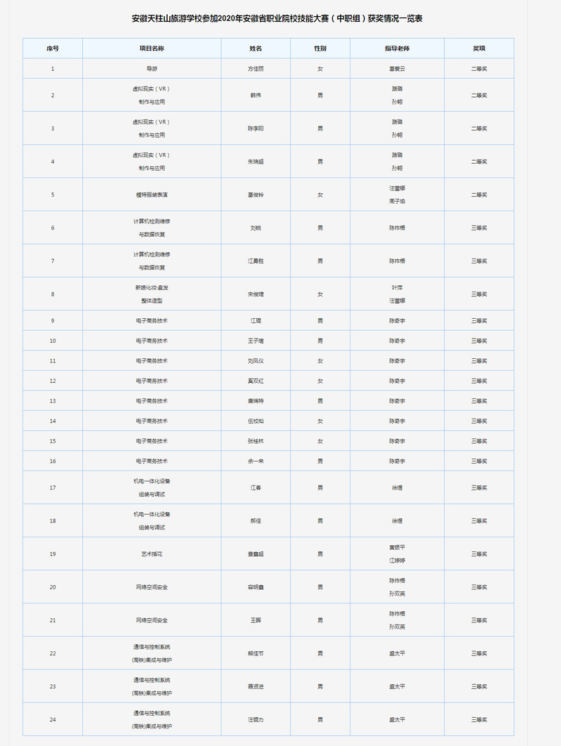 近日,2020年安徽省職業(yè)院校技能大賽(中職組)成績(jī)公布,安徽天柱山旅游學(xué)校再創(chuàng)佳績(jī),榮獲3個(gè)二等獎(jiǎng),8個(gè)三等獎(jiǎng),共有24名學(xué)生獲獎(jiǎng)。