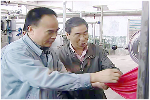 華茂集團(tuán)董事長倪俊龍與武漢紡織大學(xué)教授徐衛(wèi)林在攻關(guān)現(xiàn)場