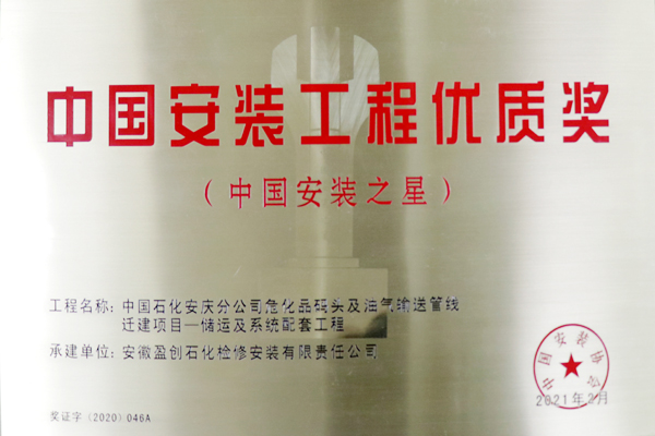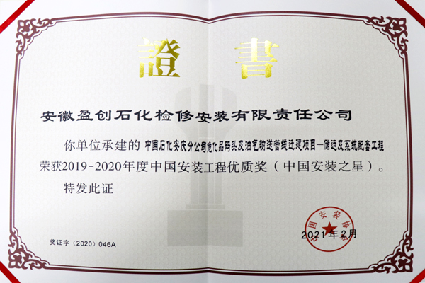 4月22日,2019-2020年度中國安裝工程優(yōu)質(zhì)獎(中國安裝之星)頒獎大會在濟南舉行,由盈創(chuàng)公司承建的中國石化安慶分公司危化品碼頭及油氣輸送管線遷建項目——儲運及系統(tǒng)配套工程 (以下簡稱8828工程)喜獲中國安裝工程優(yōu)質(zhì)獎——“中國安裝之星”,填補了公司安裝工程領域該獎項的空白。公司機動部經(jīng)理何忠民獲中國安裝工程優(yōu)質(zhì)獎(中國安裝之星)工程項目經(jīng)理特別榮譽。