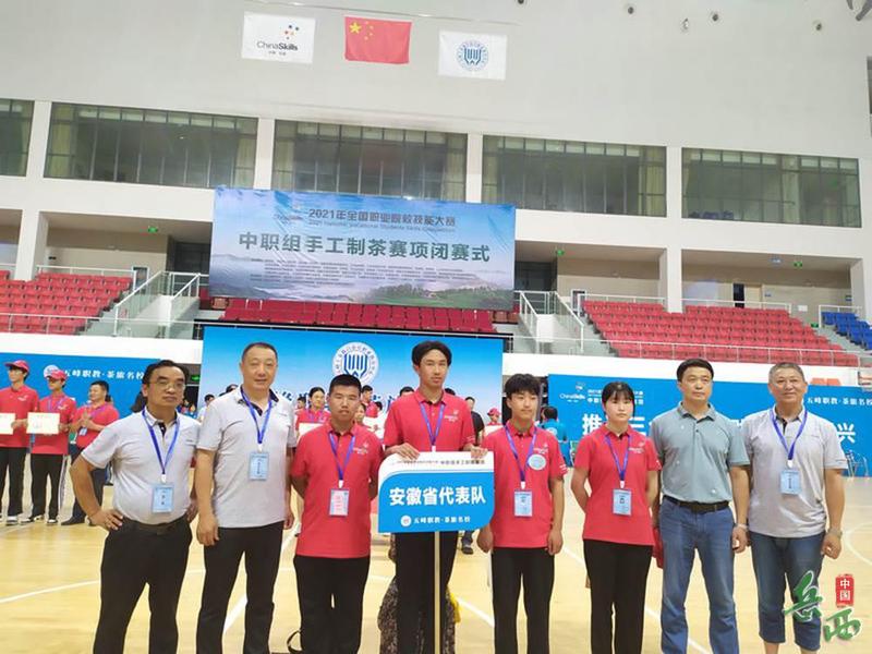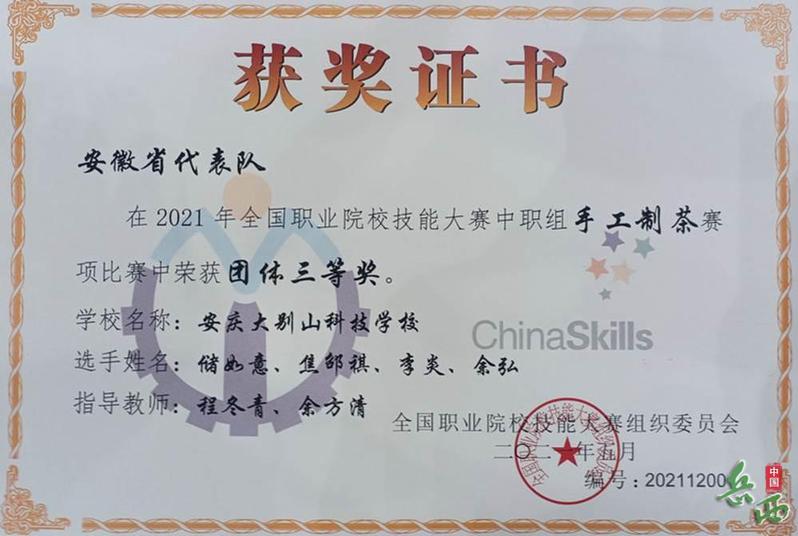 安慶大別山科技學(xué)校在2021年全國職業(yè)院校技能大賽(中職組)手工制茶項目比賽中榮獲團(tuán)體三等獎,該校學(xué)生焦邵祺、余弘、儲如意、李炎4名選手參賽。