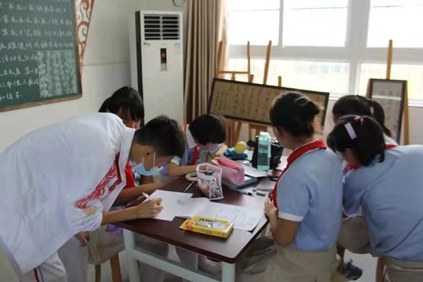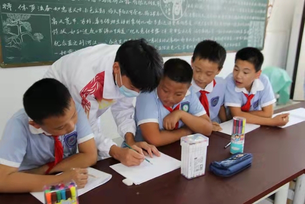 項(xiàng)目組一行在老峰鎮(zhèn)中心學(xué)校召開座談會,儲可可介紹了項(xiàng)目組成員、項(xiàng)目開展情況以及此次活動的方案、預(yù)期要達(dá)到的效果等。老峰鎮(zhèn)中心學(xué)校沈良順校長簡要介紹了老峰鎮(zhèn)中心學(xué)校校史、美術(shù)體育課程開設(shè)情況等。隨后,安慶職業(yè)技術(shù)學(xué)院藝術(shù)俱樂部部分優(yōu)秀學(xué)生深入課堂,給五、六年級學(xué)生開展繪畫、藝術(shù)體操等教學(xué)活動。