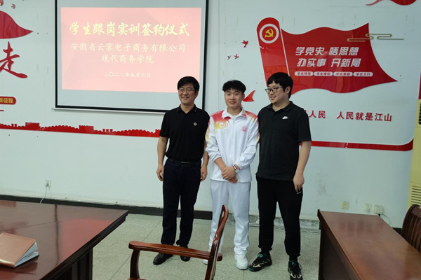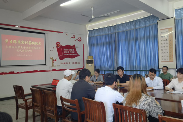 5月6日上午,安慶職業(yè)技術(shù)學(xué)院現(xiàn)代商務(wù)學(xué)院在3號(hào)教學(xué)樓510會(huì)議室,與安徽省云霽電子商務(wù)有限公司隆重舉辦20級(jí)電子商務(wù)專業(yè)學(xué)生跟崗實(shí)習(xí)簽約儀式,標(biāo)志著學(xué)院在校企合作和教學(xué)改革開(kāi)啟了新篇章?,F(xiàn)代商務(wù)學(xué)院黨總支班子成員、電子商務(wù)專業(yè)教師代表、輔導(dǎo)員及10名學(xué)生代表出席儀式,云霽電商公司總經(jīng)理程賽超一行四人出席了簽約儀式。