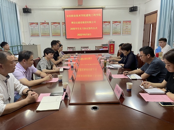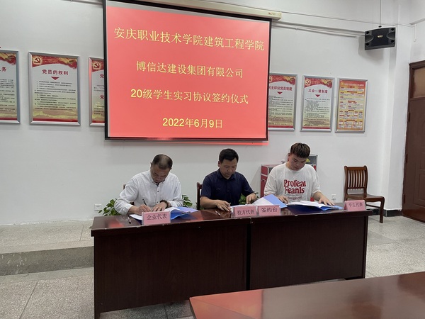 6月9日下午,安慶職業(yè)技術(shù)學(xué)院建筑工程學(xué)院與博信達(dá)建設(shè)集團(tuán)有限公司關(guān)于20級學(xué)生實(shí)習(xí)協(xié)議簽約儀式隆重舉行,博信達(dá)建設(shè)集團(tuán)有限公司總經(jīng)理張羽、建筑工程學(xué)院院長陳月萍及校企雙方部門負(fù)責(zé)人出席了儀式,該院黨總支副書記葉彤主持儀式,2020級實(shí)習(xí)學(xué)生代表參加了儀式。