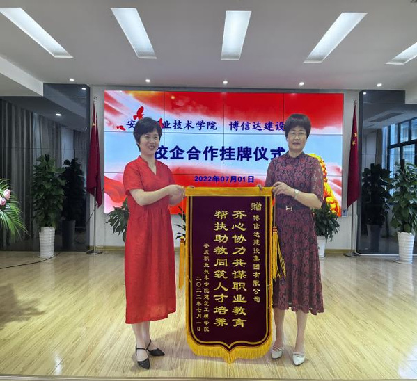 畢明生與汪賢勇共同為“國家職業(yè)教育教師教學創(chuàng)新團隊實踐教育基地”、“安慶職業(yè)技術學院建筑工程學院技能人才實習就業(yè)基地”、“博信達建設集團有限公司優(yōu)秀人才培養(yǎng)基地”、“博信達建設集團有限公司員工培訓基地”揭牌;校企雙方代表互贈錦旗,表示將依托2022級市政工程技術專業(yè),繼續(xù)開展“訂單班”培養(yǎng)模式,攜手并進深化合作,互惠雙贏共謀發(fā)展。