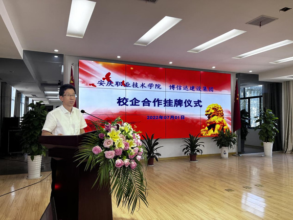 畢明生在揭牌儀式上致詞,他表示,今天是中國共產黨成立101周年的大喜日子,在這個喜慶的日子里我們進行揭牌,標志著安慶職院與博信達集團校企合作“訂單培養(yǎng)”邁上了新臺階。畢明生強調安慶職院作為安慶職教集團龍頭單位,時刻牢記市屬高校這一基本屬性,時刻謹記為企業(yè)服務的辦學理念,時刻銘記服務地方經濟發(fā)展的初心使命,通過專業(yè)跟著產業(yè)走,教師圍繞學生轉,教學過程與生產過程、課程設置與崗位需求進行對接,從而提高人才培養(yǎng)針對性。當前學校在人才培養(yǎng)上實現(xiàn)了三大突破:一是招生規(guī)模大幅增長,今年招生將達到5000人以上;二是本地就業(yè)率已經達到40%;三是2021年安慶職院成功入選全國鄉(xiāng)村振興人才培養(yǎng)優(yōu)質校,同時學校也是國家示范性職業(yè)教育集團培育單位。這些為我們校企雙方進一步深化合作招生、合作培養(yǎng)、合作就業(yè)打下良好基礎,下一步校企雙方要拓展合作、創(chuàng)新管理,形成“博信達”品牌模式,在全校乃至全省范圍建立示范帶動效應,積極為安慶職院創(chuàng)建第一批本科專業(yè)目標努力奮斗,為安慶挺進百強上臺階作出職業(yè)教育應有的貢獻。