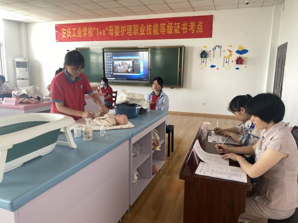 2022年6月11日上午教育部1+X母嬰護理職業(yè)技能等級證書考試在安慶專業(yè)學(xué)校實訓(xùn)樓舉行。本次考試由教育部認(rèn)證的第三方機構(gòu)——山東陽光大姐服務(wù)有限公司考評站與工業(yè)學(xué)校共同負(fù)責(zé)實施,圓滿完成了 36名學(xué)前教育專業(yè)在校學(xué)生的考證工作??紕?wù)安排井然有序,得到了考評領(lǐng)導(dǎo)和專家的一致好評。