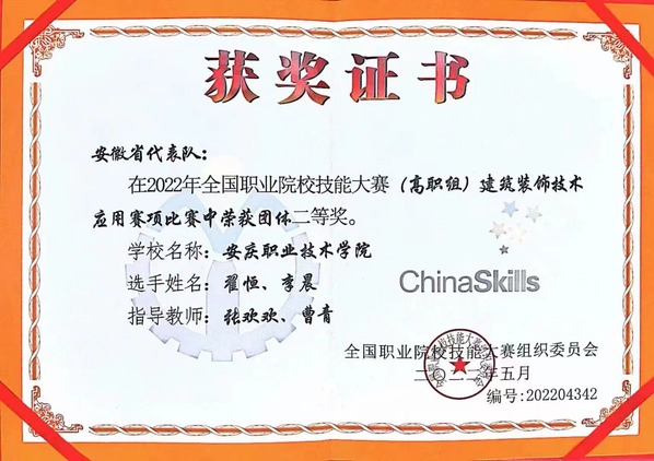 8月27日安慶職業(yè)教育集團張歡歡、曹青老師指導翟恒、李晨兩位學生,在山東城市建設職業(yè)技術學院舉辦的2022年全國職業(yè)院校技能大賽高職組“建筑裝飾技術應用”賽項中喜獲團體二等獎。