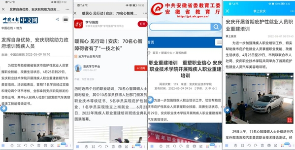 安慶職院作為省、市兩級(jí)殘疾人技能培訓(xùn)基地,一直以高度社會(huì)責(zé)任感開(kāi)展殘疾人職業(yè)技能培訓(xùn),致力于服務(wù)好每一位社會(huì)殘障人士。幫助他們掌握了一定的職業(yè)技能,增強(qiáng)他們熱愛(ài)生活、融入社會(huì)的信心,用熱情給大量殘疾人家庭帶來(lái)了活力與希望。開(kāi)展“殘疾人職業(yè)重建”培訓(xùn)項(xiàng)目以來(lái),面向安慶市心智障礙人士提供了諸如面點(diǎn)、插花、烘焙、汽車(chē)美容、短視頻制作等技能培訓(xùn),還針對(duì)他們自卑、焦躁等負(fù)面情緒,開(kāi)設(shè)了藝術(shù)調(diào)理類(lèi)等心理輔導(dǎo)課程,幫助他們調(diào)節(jié)身心。僅今年上半年就有11名學(xué)員通過(guò)汽車(chē)美容和烘焙技能考核,獲得人社部門(mén)頒發(fā)的職業(yè)資格證書(shū),并推薦到愛(ài)心企業(yè)實(shí)現(xiàn)就業(yè)。先后被中國(guó)日?qǐng)?bào)、學(xué)習(xí)強(qiáng)國(guó)、安徽省教育廳、安徽省殘聯(lián)等單位報(bào)道。