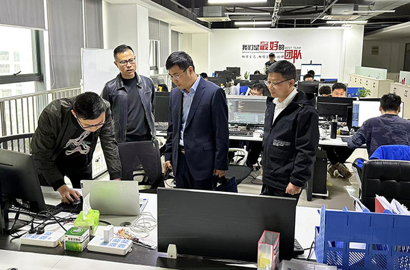 在安徽峰速網(wǎng)絡(luò)智能科技有限公司走訪調(diào)研中,疏國會一行在董事長余賢良的陪同下詳細了解了該公司的發(fā)展歷程、企業(yè)文化、企業(yè)運營等情況,參觀了項目研發(fā)現(xiàn)場,并與研發(fā)人員就技術(shù)、人才和市場等方面進行了交流。