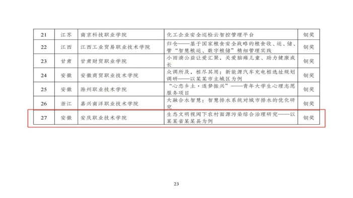 該作品著眼于“農(nóng)村面源污染”問題,致力于加強農(nóng)村生態(tài)文明建設(shè),有力推進美麗鄉(xiāng)村建設(shè),增強農(nóng)民群眾的幸福感和獲得感,極具社會價值和實踐意義。為備戰(zhàn)本次賽事,學(xué)院領(lǐng)導(dǎo)和指導(dǎo)老師精心組織,積極籌備,努力提高競技水平。校領(lǐng)導(dǎo)高度重視此次國賽,校黨委委員、統(tǒng)戰(zhàn)部部長李五一、團委及學(xué)生處負責(zé)同志親臨鄭州,慰問和鼓勵參賽學(xué)生。同學(xué)們也不負眾望,最終在眾多強隊中脫穎而出,榮獲銅獎,充分展示了安慶職院學(xué)子的青春風(fēng)采。