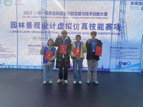 11月11日,2023 一帶一路暨金磚國家技能發(fā)展與技術(shù)創(chuàng)新大賽“園林景觀設(shè)計虛擬仿真技能賽項”在河南農(nóng)業(yè)職業(yè)技術(shù)學(xué)院舉行,來自全國28個省、市、自治區(qū)193支隊伍參加了此次比賽。經(jīng)過一整天的緊張比拼,經(jīng)安慶職業(yè)技術(shù)學(xué)院農(nóng)林與服裝學(xué)院唐長貞老師、哈滿林、葛尹睿三位老師指導(dǎo),由22園林技術(shù)班張成瑜、劉子翔組成的2隊和張晨晨、張永樂組成的1隊分別獲得二等獎和三等獎。