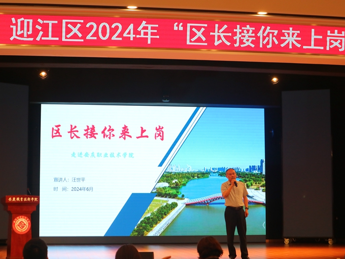 致辭中,畢明生說,連續(xù)三年,迎江區(qū)區(qū)長親自來學(xué)校開展“區(qū)長接你來上崗”活動,為企業(yè)招人才、為學(xué)生搭平臺,不僅體現(xiàn)區(qū)政府對所轄企業(yè)的關(guān)心和厚愛,也體現(xiàn)迎江區(qū)對安慶職業(yè)技術(shù)學(xué)院莘莘學(xué)子的信任和期待,體現(xiàn)迎江區(qū)對學(xué)校人才培養(yǎng)質(zhì)量的高度認(rèn)可。