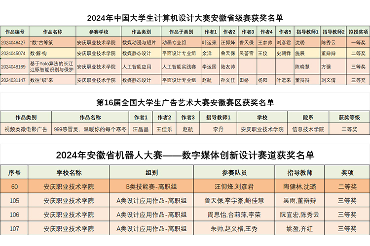 在安徽省教育廳公布的《關(guān)于公布2024年7月至8月安徽省大學(xué)生學(xué)科和技能競(jìng)賽部分賽事獲獎(jiǎng)名單的通知》中,安慶職院沈璐、陳秀云老師指導(dǎo)的葉運(yùn)來(lái)、汪仰烽、魯天保、王夢(mèng)帥、劉彥君學(xué)生團(tuán)隊(duì)獲得2024年中國(guó)大學(xué)生計(jì)算機(jī)設(shè)計(jì)大賽安徽省級(jí)賽“數(shù)媒動(dòng)漫與短片類-動(dòng)畫(huà)專業(yè)組”一等獎(jiǎng);施展、董辯辯老師指導(dǎo)的余洋、魯天保、吳莟雪、王佼、史朝霖學(xué)生團(tuán)隊(duì)獲得“數(shù)媒靜態(tài)設(shè)計(jì)類-平面設(shè)計(jì)專業(yè)組”二等獎(jiǎng);陳曉慧、方驥、董辯辯、劉文倩老師指導(dǎo)的學(xué)生團(tuán)隊(duì)分別獲得“人工智能應(yīng)用類-人工智能實(shí)踐賽”和“數(shù)媒靜態(tài)設(shè)計(jì)類-平面設(shè)計(jì)專業(yè)組”三等獎(jiǎng)。在第16屆全國(guó)大學(xué)生廣告藝術(shù)大賽安徽賽中,李丹老師指導(dǎo)的汪晶晶、王佳樂(lè)、趙航學(xué)生團(tuán)隊(duì)獲得“視頻類微電影廣告”二等獎(jiǎng)。