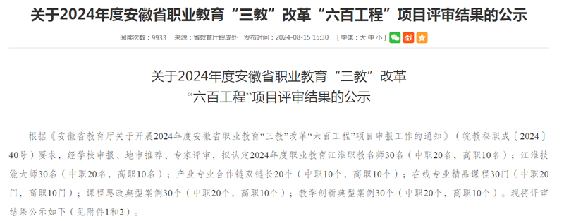 近日,安徽省教育廳公示了2024年度安徽省職業(yè)教育“三教”改革“六百工程”項(xiàng)目,集團(tuán)5所學(xué)校共7個項(xiàng)目入選。