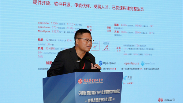 會(huì)上,華為技術(shù)有限公司培訓(xùn)與認(rèn)證部解決方案總監(jiān)李洪臣介紹了華為自主創(chuàng)新產(chǎn)業(yè)生態(tài),并發(fā)布安徽省2024產(chǎn)學(xué)合作創(chuàng)新課題。該課題是在安徽省教育廳指導(dǎo)下,由華為公司聯(lián)合安徽省職業(yè)教育與產(chǎn)業(yè)發(fā)展研究中心、安徽省職業(yè)院校現(xiàn)代產(chǎn)業(yè)學(xué)院管理辦公室,參照教育部產(chǎn)學(xué)合作協(xié)同育人項(xiàng)目設(shè)置內(nèi)容與運(yùn)作機(jī)制在安徽省搭建的人才培養(yǎng)與教研教改平臺(tái)。課題將圍繞華為自主創(chuàng)新產(chǎn)業(yè)發(fā)展與人才培養(yǎng),設(shè)置政策研究、教學(xué)改革、師資培訓(xùn)等課題,吸引高校教師參與自主創(chuàng)新生態(tài)建設(shè),將行業(yè)技術(shù)融入人才培養(yǎng)體系中,進(jìn)而提高辦學(xué)質(zhì)量和產(chǎn)教融合水平。該課題將由安徽省教育廳納入省級(jí)質(zhì)量工程建設(shè)管理。對(duì)順利結(jié)項(xiàng)課題,華為技術(shù)有限公司將給予每項(xiàng)3-5萬(wàn)元經(jīng)費(fèi)資助。
