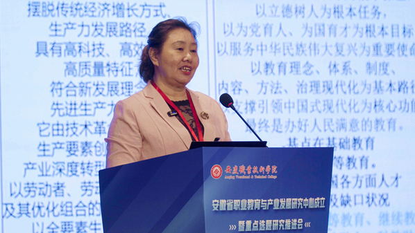 唐厚明代表安慶市政府對(duì)研究中心的成立表示熱烈的祝賀。他指出,安慶正在深入學(xué)習(xí)宣傳貫徹習(xí)近平總書(shū)記考察安徽重要講話精神,安慶發(fā)展比以往任何時(shí)候都更需要職教人才。職業(yè)教育是培養(yǎng)高素質(zhì)技術(shù)技能人才最高效、最基礎(chǔ)的途徑,是推動(dòng)高質(zhì)量發(fā)展的重要支撐。近年來(lái),安慶緊緊圍繞產(chǎn)業(yè)發(fā)展和社會(huì)需求,積極開(kāi)展職業(yè)教育綜合改革和產(chǎn)教融合研究,推動(dòng)教育鏈、人才鏈與產(chǎn)業(yè)鏈、創(chuàng)新鏈有機(jī)銜接。安慶職業(yè)技術(shù)學(xué)院作為安慶市屬唯一綜合性高職院校、安徽省首批地方技能型高水平大學(xué),在推動(dòng)產(chǎn)教融合、校企合作、中高職一體化發(fā)展上發(fā)揮了重要的龍頭作用,在服務(wù)安慶新能源汽車(chē)產(chǎn)業(yè)集聚發(fā)展、文旅融合發(fā)展、鄉(xiāng)村振興人才培養(yǎng)、畢業(yè)生本地高質(zhì)量就業(yè)等方面作出了不可替代的重要貢獻(xiàn)。安慶職業(yè)教育改革發(fā)展取得的成績(jī),離不開(kāi)省委教育工委、省教育廳和與會(huì)專(zhuān)家長(zhǎng)期以來(lái)的關(guān)心和指導(dǎo)。為高質(zhì)量推進(jìn)省級(jí)研究平臺(tái)建設(shè),他懇請(qǐng)省教育廳在研究中心后續(xù)建設(shè)發(fā)展中能夠持續(xù)給予關(guān)心和支持,歡迎石偉平教授等省內(nèi)外專(zhuān)家能夠持續(xù)不斷給予指導(dǎo)、幫助研究中心快速成長(zhǎng)、優(yōu)質(zhì)發(fā)展,期待研究中心通過(guò)集聚研究力量在職業(yè)教育研究領(lǐng)域打造安徽品牌。