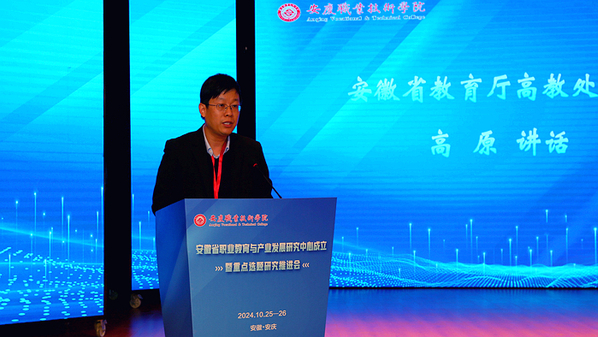 高原代表安徽省教育廳高教處對(duì)研究中心的成立表示熱烈的祝賀,并為研究中心專(zhuān)家指導(dǎo)委員會(huì)委員頒發(fā)聘書(shū)。他指出,安徽高教戰(zhàn)線正在以習(xí)近平總書(shū)記殷殷囑托為指引,全面學(xué)習(xí)宣傳貫徹總書(shū)記關(guān)于教育的重要論述、考察安徽重要講話精神,認(rèn)真貫徹落實(shí)全國(guó)教育大會(huì)關(guān)于教育強(qiáng)國(guó)建設(shè)的總體部署要求,錨定打造“三地一區(qū)”戰(zhàn)略定位,全面落實(shí)立德樹(shù)人根本任務(wù),持續(xù)提升高等教育創(chuàng)新發(fā)展能力,切實(shí)推動(dòng)安徽高等教育內(nèi)涵式發(fā)展、高質(zhì)量發(fā)展。他指出,在過(guò)去二十多年里,安徽在加快高等職業(yè)教育改革發(fā)展上作出了很多創(chuàng)新性探索,實(shí)踐豐富多彩但理論研究卻相對(duì)滯后。研究中心的成立,是我省集聚力量、創(chuàng)新機(jī)制、打造平臺(tái),加快補(bǔ)齊研究“短板”的重要舉措。他強(qiáng)調(diào),研究中心要聚焦安徽省職業(yè)教育和產(chǎn)業(yè)發(fā)展的現(xiàn)實(shí)問(wèn)題,堅(jiān)持問(wèn)題導(dǎo)向、項(xiàng)目推動(dòng),真正發(fā)揮好省級(jí)研究基地的平臺(tái)功能,有效地凝聚起全省職業(yè)教育研究力量,有組織、接地氣地開(kāi)展研究。要聚焦安徽產(chǎn)業(yè)創(chuàng)新發(fā)展、職業(yè)教育內(nèi)涵建設(shè)、產(chǎn)教供需適配機(jī)制建設(shè)、產(chǎn)教科城融合發(fā)展、職業(yè)教育制度供給等方面加強(qiáng)研究,培育產(chǎn)出高質(zhì)量研究成果,早日成為安徽職業(yè)教育改革發(fā)展的理論高地、智庫(kù)平臺(tái)、學(xué)術(shù)窗口、靚麗名片。