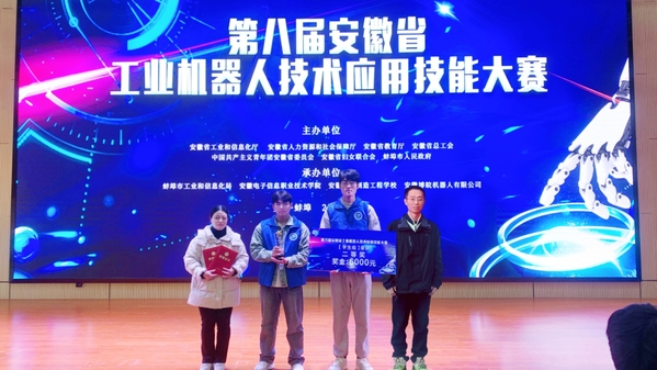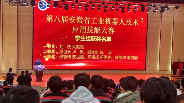11月28日,安徽省經(jīng)濟(jì)和信息化廳、安徽省人力資源和社會(huì)保障廳、安徽省教育廳、安徽省總工會(huì)、共青團(tuán)安徽省委員會(huì)、安徽省婦女聯(lián)合會(huì)、蚌埠市人民政府聯(lián)合舉辦的第八屆安徽省工業(yè)機(jī)器人技術(shù)應(yīng)用技能大賽在蚌埠市安徽電子信息職業(yè)技術(shù)學(xué)院圓滿落幕。安慶職業(yè)技術(shù)學(xué)院機(jī)電工程學(xué)院工業(yè)機(jī)器人技術(shù)專業(yè)學(xué)生應(yīng)世永和盧嵐組成的團(tuán)隊(duì),在指導(dǎo)老師姚兆鳳和陳祺的悉心指導(dǎo)下,憑借出色的專業(yè)技能和團(tuán)隊(duì)協(xié)作精神,榮獲大賽第二名(二等獎(jiǎng))的優(yōu)異成績(jī)。