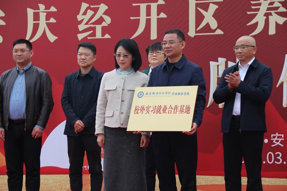 為更好地服務(wù)安慶地方養(yǎng)老事業(yè)發(fā)展,促進(jìn)養(yǎng)老人才留宜,擴(kuò)大校企合作覆蓋面,3月1日,安慶職業(yè)技術(shù)學(xué)院管理服務(wù)學(xué)院與安慶市經(jīng)開(kāi)區(qū)養(yǎng)老服務(wù)中心正式舉行校企合作基地揭牌儀式。市民政局局長(zhǎng)蔡婷婷,經(jīng)開(kāi)區(qū)黨工委委員、管委會(huì)副主任畢圣國(guó),市醫(yī)保局副局長(zhǎng)李?lèi)?ài)斌,市衛(wèi)健委黨組成員、辦公室主任孔軍出席活動(dòng)。安慶職院管理服務(wù)學(xué)教學(xué)工作負(fù)責(zé)人代表該院與老峰鎮(zhèn)黨委書(shū)記陳士兵共同為經(jīng)開(kāi)區(qū)養(yǎng)老服務(wù)中心“校外實(shí)習(xí)就業(yè)合作基地“揭牌。